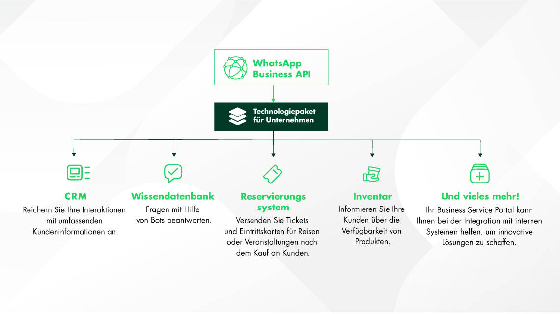 - Chatbots: Auf der WhatsApp API können Chatbots programmiert werden, die insbesondere im First-Level-Support entlasten und wertvolle Ressourcen schonen. WhatsApp Chatbots sind 24/7 verfügbar, lernen ständig dazu, sind sehr schnell, können auf bekannten Daten aufbauen und sind wartungsarm.